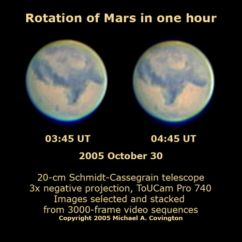 As you can see, the dust storm on Mars is continuing. These two pictures were taken four minutes apart and should look just alike, but one came out sharper than the other due to changing atmospheric conditions on Earth. Each was taken with an 8-inch Meade LX200, 2x Barlow lens giving f/20, Philips ToUCam Pro, K3CCD Tools, and Registax.