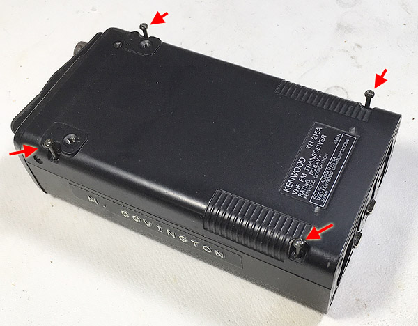 The Kenwood TH-215A ham radio handheld transceiver (HT) uses a lithium coin cell for memory backup. I bought my TH-215A in 1988, made my very first contact with it when I got my license, and want to keep it functioning. Recently, it started losing the channel memories when turned off. Of course, it needed the coin cell replaced. The procedure I will describe here involved tack-soldering a new cell from the top of the circuit board, without taking the circuit board out. Don't be afraid of tack-soldering; with enough solder, well melted, it is as reliable as soldering wires that are already mechanically connected. Tack-soldering means coating both surfaces with a generous glob of solder (think "glob," not "coating"), then holding them together and re-melting the solder. Then you have to hold everything very steady while the solder hardens — only a couple of seconds if you have good 63-37 tin-lead solder. The replacement cell should be equivalent to a CR2032. You can get CR2032s with solder tabs at Batteries Plus (they put the tabs on while you watch), but I chose to use this low-priced imported CR2025, which is slightly smaller (making the repair easier) but may not last as long. It's a popular item for repairing Pokémon games of some sort, and you may even be able to get it from a computer game dealer. (My original coin cell failed 30 years after I bought the transmitter; it was a couple of years old already then. Maybe the new one will only last 20 years. That's good enough!) The photography here was done hastily with an iPhone and is not up to my usual standard. If I were writing this up for a magazine, the pictures would be much better. As it is, I'm writing a Daily Notebook entry in haste. Step 1: Remove the antenna and battery pack. Then remove the belt clip, if present (2 screws, Phillips #2).