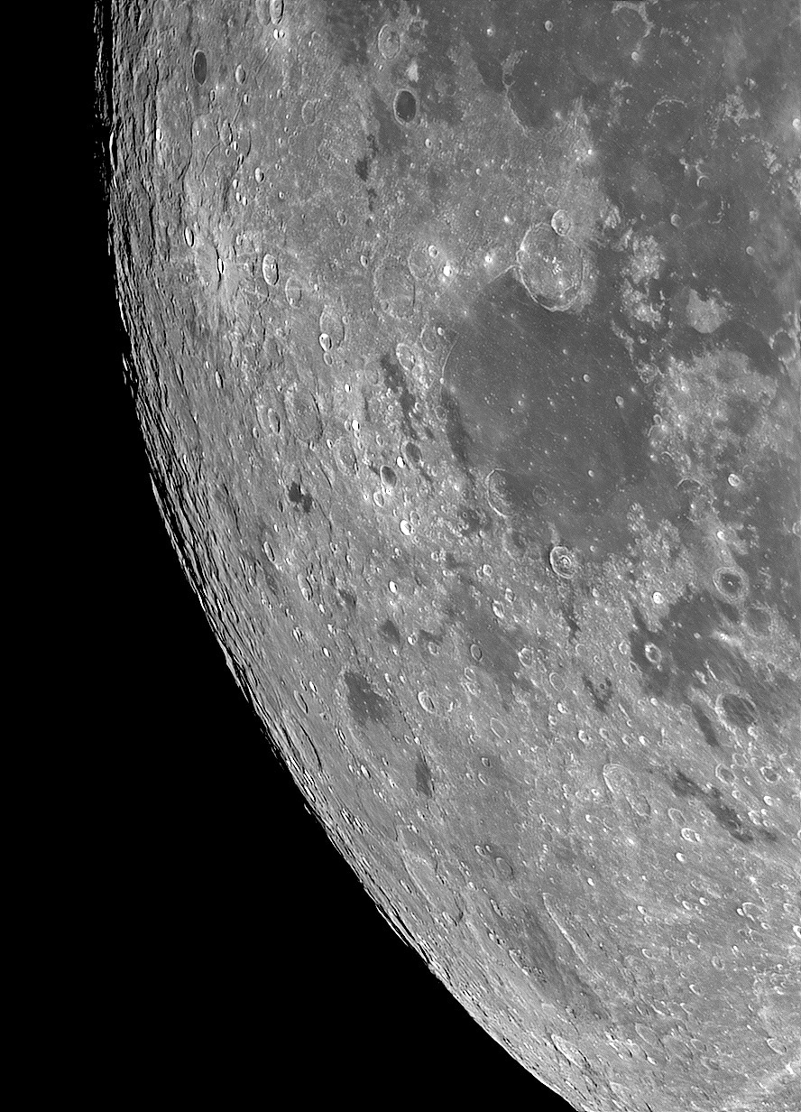 The moon at lower magnification Here are a couple of wide-field views of the moon, taken with my vintage 1980 Celestron 5 and the ASI120MM-S camera (with an infrared-pass filter; these are infrared images). A field including Oceanus Procellarum. The very leftmost thing in this picture is a mountain range surrounding Mare Orientale, right on the edge of the visible face of the moon: