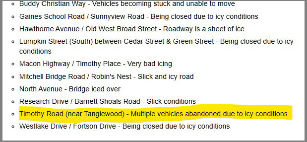 OK, snow, that's enough... We've had another 2-inch-or-so snowfall in Athens, which stuck to the ground because we've been having unseasonably cold weather, and we've stayed in the house. Here is the city government's incomplete report of road conditions yesterday (Tuesday, Jan. 21):